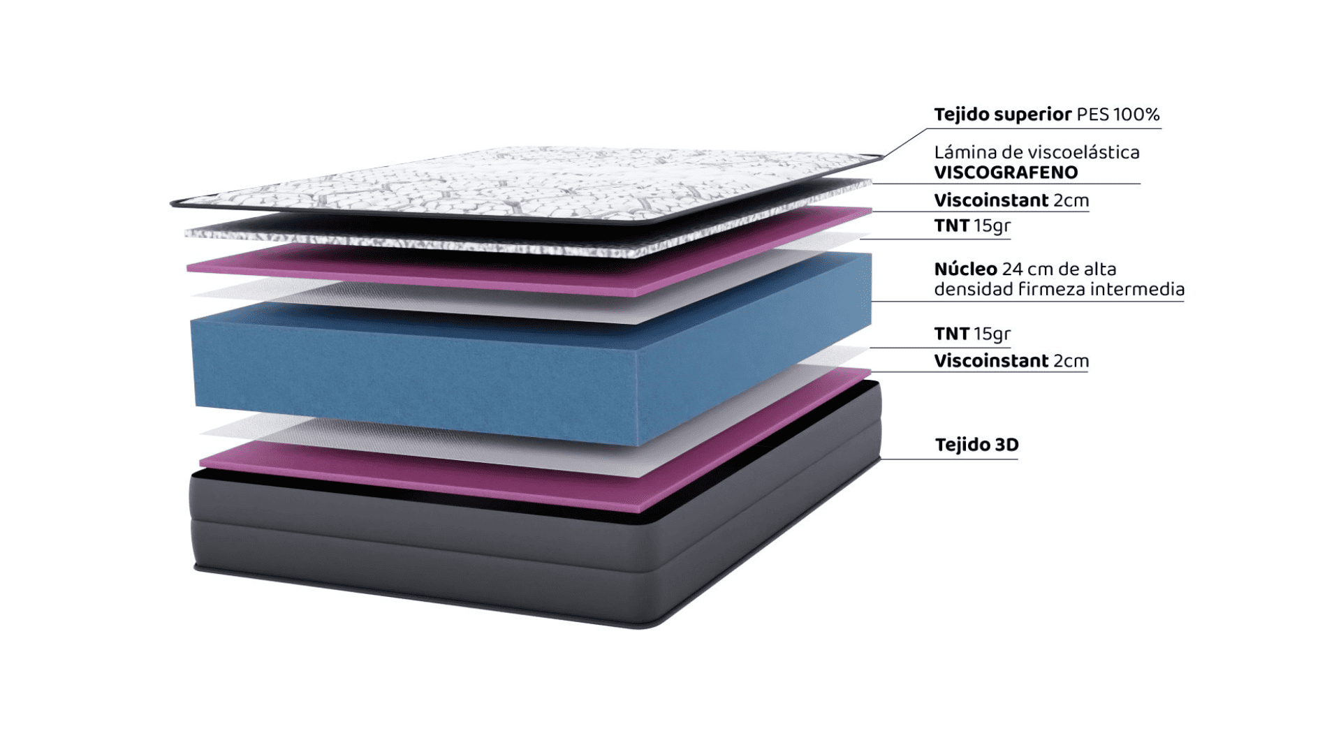 El colchón Viscografeno 1 ofrece una experiencia de descanso insuperable. Equipado con un núcleo de espuma HR ecológica y un sistema multicapa con viscoelástica de grafeno, este colchón garantiza una óptima regulación térmica y una relajación muscular completa.