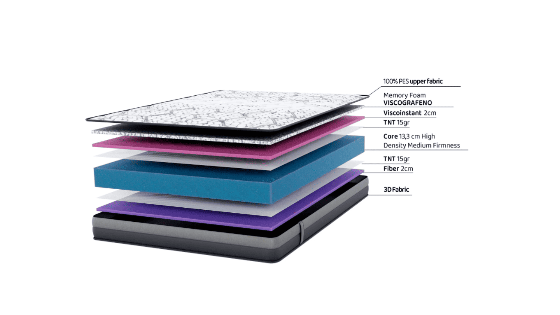 El colchón incluye un doble acolchado con Viscoinstant, un material desarrollado para mejorar la adaptabilidad del colchón al cuerpo. Además, su acolchado de viscoelástica de grafeno (densidad de 50 kg/m³) es un componente clave para la regulación de la temperatura durante el descanso. El grafeno actúa como un material hiperconductor, eliminando el exceso de calor y mejorando la disipación de la carga electrostática que acumulamos a lo largo del día. Esto permite un descanso más profundo y reparador.
